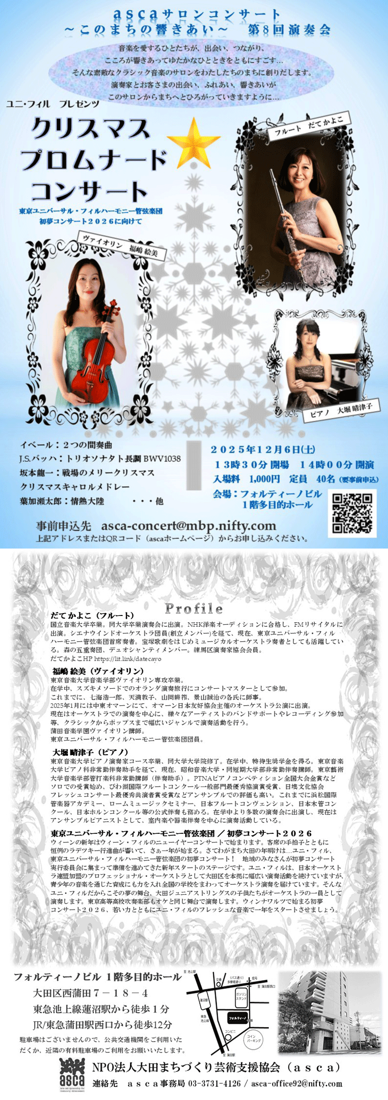 第8回 クリスマス プロムナード コンサート ~ ユニ・フィル プレゼンツ / 初夢コンサート2026に向けて ~ 2025年12月6日(土)午後1時30分開場 会場 フォルティーノビル1F会議室 池上線蓮沼駅下車徒歩2分 ( 駐車場はありません 近隣の有料駐車場をご利用ください ) 入場人数に限りがありますので事前予約をお願いしております 演奏終了後に演奏者とお客さまの交流の時間を設けております