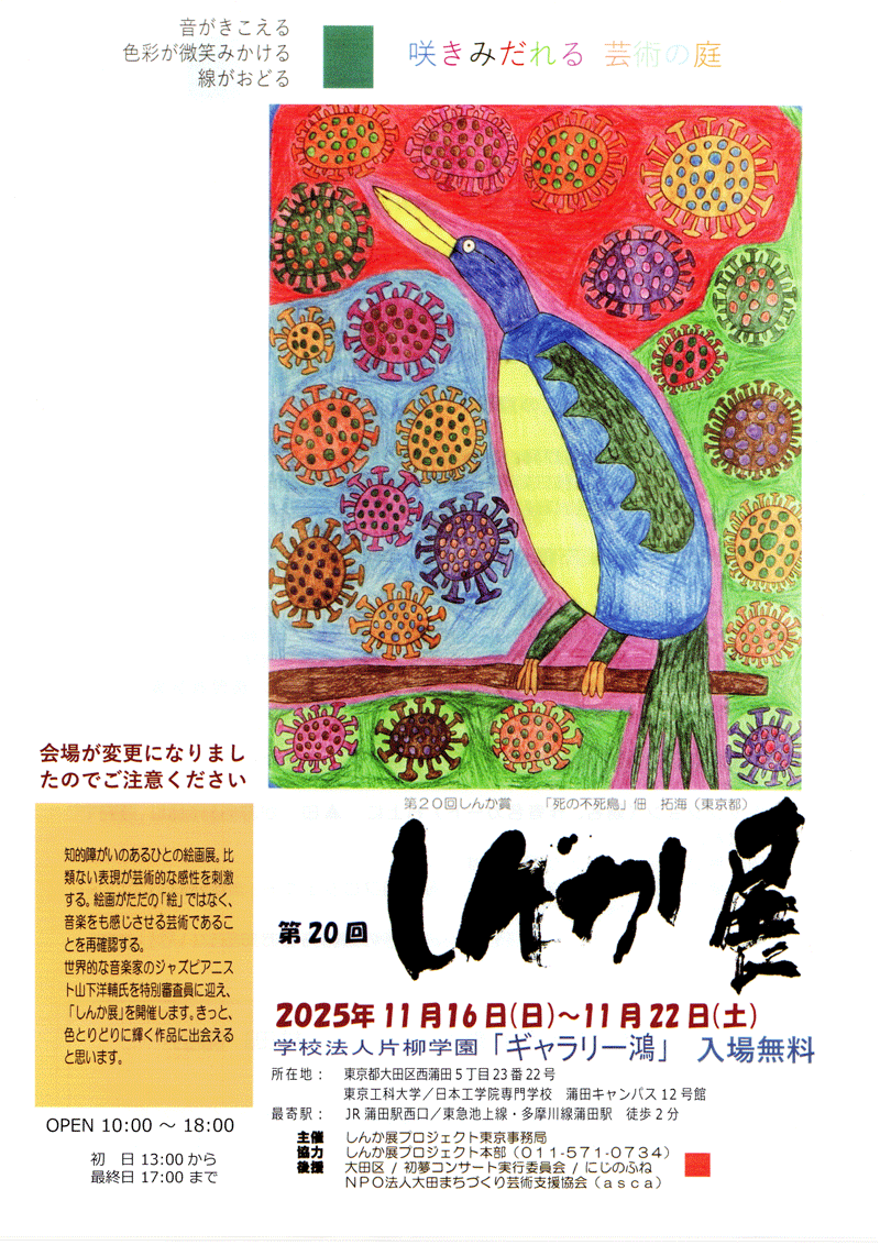 「しんか展」は知的障がい、発達障がいのある方々が描いた絵画の展覧会です。題名の「しんか」は、真価…真の芸術性を表現する、深化…作者の芸術性が深まっていく、そして新化…ここに掲げられた作品が正当な評価を受け自信をもって新しい一歩を踏み出してほしいと願って名づけられました。掲げられた作品を通して作者ひとりひとりの独自の視点から紡ぎだされる豊かな世界が見えてきます。「咲き乱れる芸術の庭」の副題にあるとおりユニークな絵画が並んで鑑賞してくれる人を待っています。ここにある一枚一枚の絵の前にたって作者との対話を楽しんでみてはいかがでしょうか。第20回を迎える今年は会場を蒲田駅近くの「ギャラリー鴻」に移しての開催です。ご来場をお待ちしております。