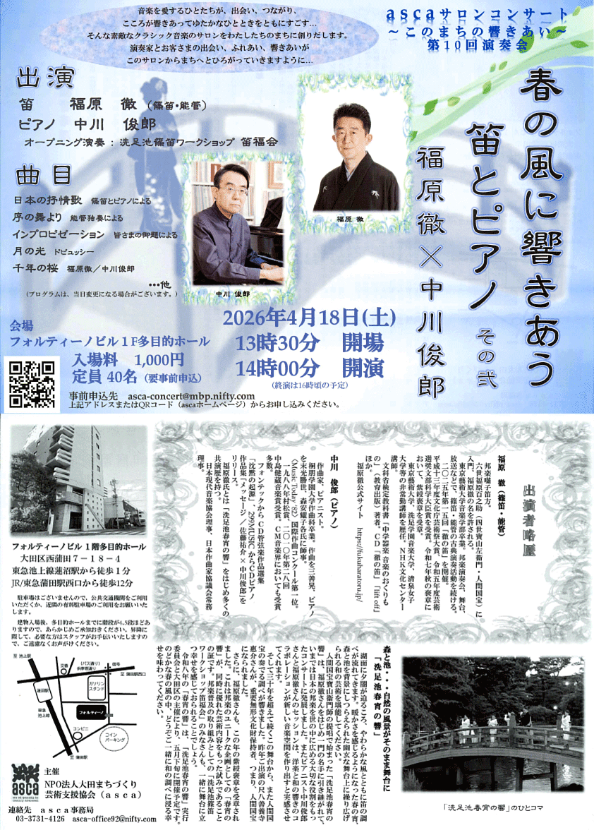 第10回 春の風に響きあう笛とピアノ その弐 ~ 福原 徹 X 中川俊郎 ~ 2026年4月18日(土)午後1時30分開場 会場 フォルティーノビル1F会議室 池上線蓮沼駅下車徒歩2分 ( 駐車場はありません 近隣の有料駐車場をご利用ください ) 入場人数に限りがありますので事前予約をお願いしております 演奏終了後に演奏者とお客さまの交流の時間を設けております
